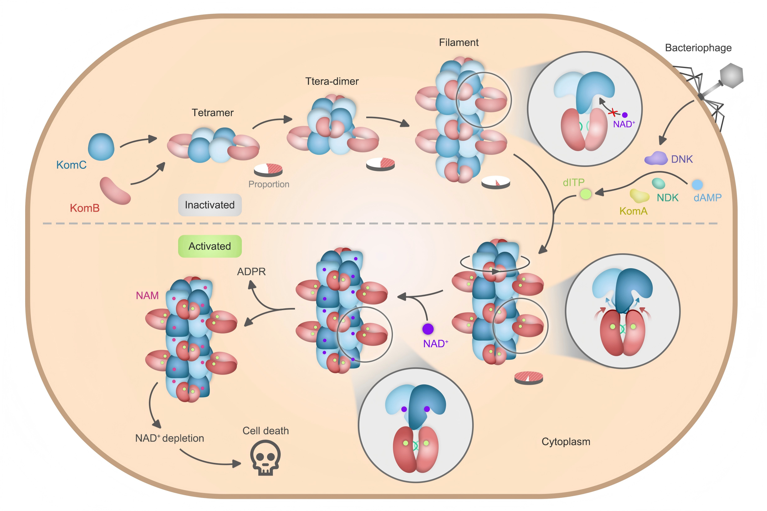 孔明抗噬菌体系统是2025年华中农业大学韩文元教授发现的利用碱基修饰核苷酸作为第二信使的细菌免疫防御系统,孔明系统由KomA、KomB、KomC三个蛋白组成,当噬菌体入侵时,噬菌体来源的脱氧核苷酸激酶(DNK)参与dITP的合成。然而,孔明系统如何识别dITP以及dITP如何激活KomC的NAD水解酶活性一直不清楚。研究人员选取了来源于 Archangium gephyra 菌株的孔明抗噬菌体系统,发现KomB 与 KomC 形成的 KomBC 复合物以 4∶4 的方式组装,在 dITP 存在的条件下表现出极强的 NAD⁺ 水解活性。