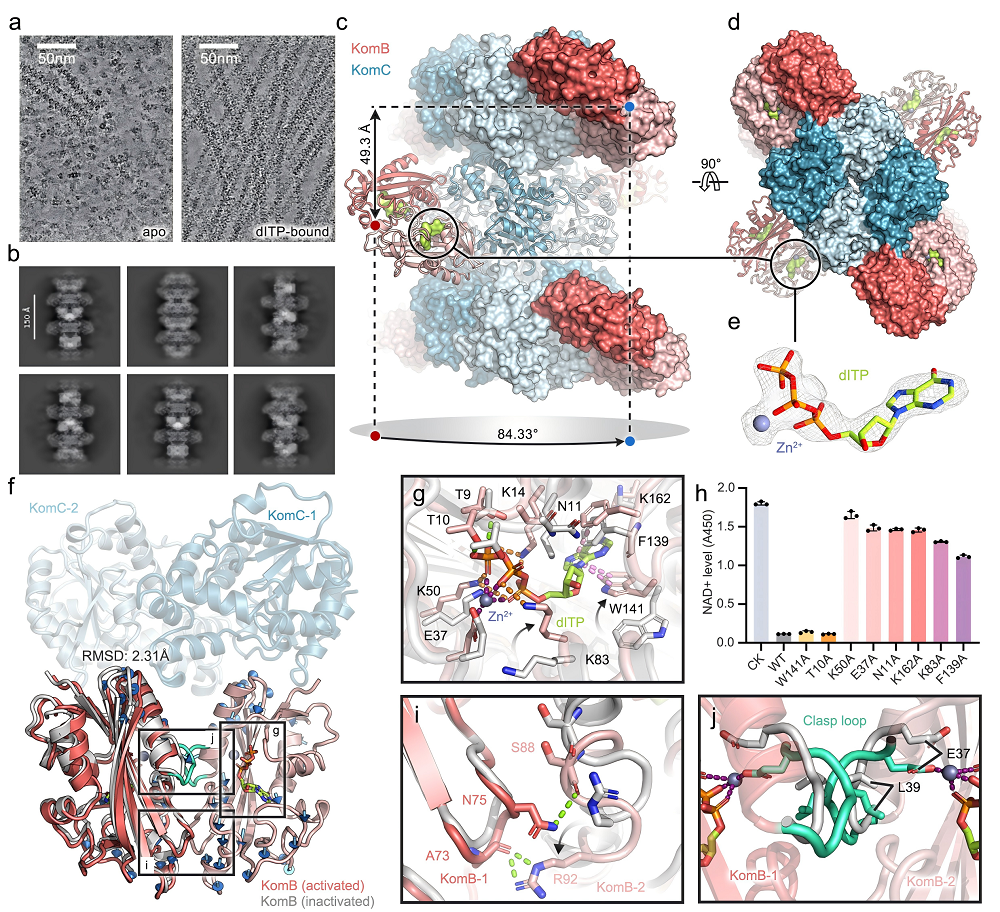 为进一步揭示dITP 对 KomBC 复合物的激活机制,研究人员利用冷冻电镜技术解析了加入 dITP 后的结构。结果发现,dITP 的加入会显著促进 KomBC 复合物由游离状态向纤维状结构转变(图1),尽管在未加入 dITP 时已有少量复合物呈现纤维状构象,电镜图片显示dITP 明显加速了这一聚集过程。对 dITP 关键结合位点进行点突变后,复合物的 NAD⁺ 水解活性均出现不同程度的下降。结构对比分析显示,dITP 结合后2分子的 KomB 之间形成类似“握手”的构象变化,使其相互作用更加紧密。