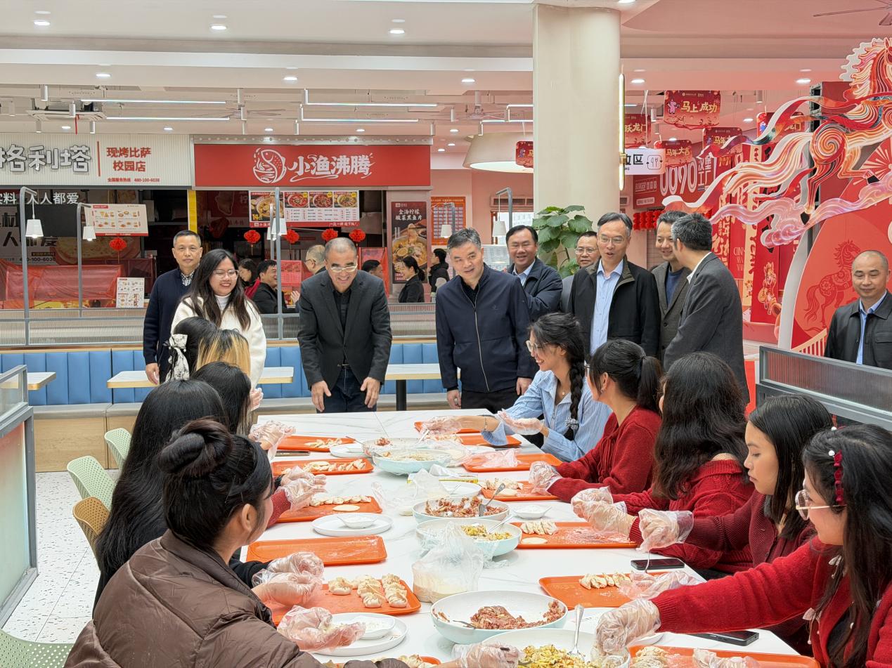 在值班餐厅,暖意融融、年味浓厚,校领导与留校学生们亲切交谈、共话家常,细致询问同学们假期学习计划、生活起居及实际需求,鼓励同学们合理规划假期时光,劳逸结合、充实自我,积极参与校园新春民俗活动,在体验中华优秀传统文化中感受年味。校领导要求有关单位细化服务保障举措,丰富留校学生假期文化生活,全方位做好饮食安全、住宿保障等服务,切实解决同学们的实际困难,确保同学们在校园度过一个温馨、欢乐、有温度的春节。
