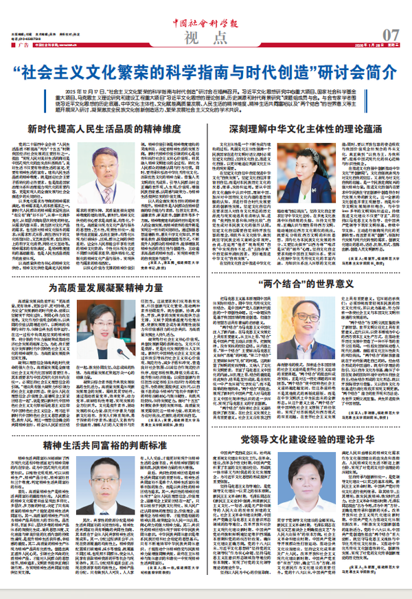 1月28日,《中国社会科学报》以专版形式,图文并茂报道了习近平文化思想研究中心重大项目“习近平文化思想的理论创新、历史渊源和时代背景研究”举办的“社会主义文化繁荣的科学指南与时代创造”研讨会情况,并刊发了课题组潘玉腾教授、傅慧芳教授、黄雯教授、李瑞德教授、朱新屋教授、陈一收教授的发言内容。(马克思主义学院)