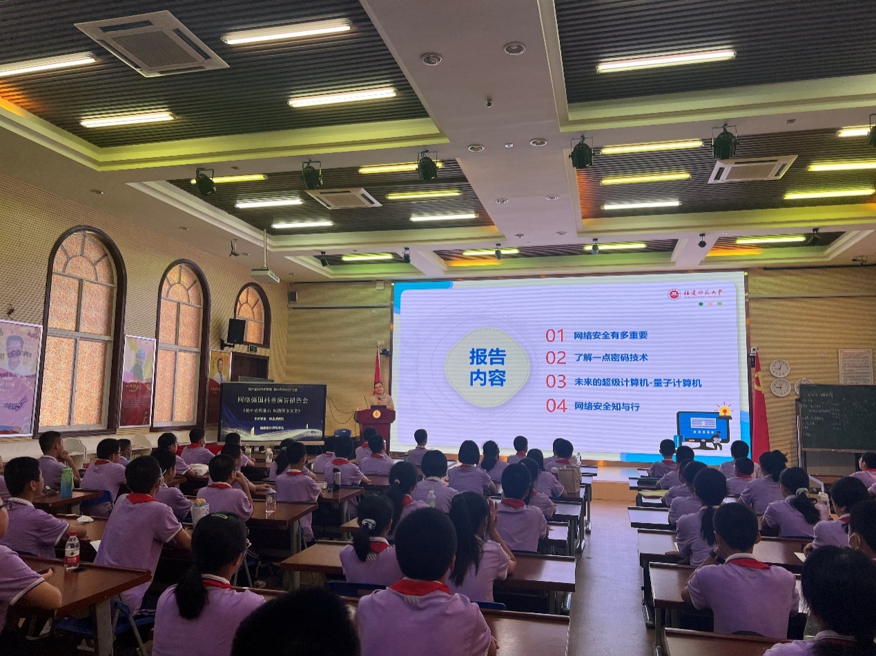 9月23日,福建省2023年全国科普日活动——网络强国科普演讲报告会在福州屏东中学举行,2000余名中小学生以线上、线下形式参与了活动。我校计算机与网络空间安全学院软件工程系主任熊金波教授应邀为青少年作题为《筑牢密码基石,赋能国家安全》科普讲座。他结合科研经验,用真实案例深入浅出地介绍了生活中常见的网络安全隐患,生动阐述了密码技术对网络安全、国家安全的重要性,帮助青少年提高网络安全防范意识。活动现场互动频繁,气氛活跃。(计算机与网络空间安全学院)