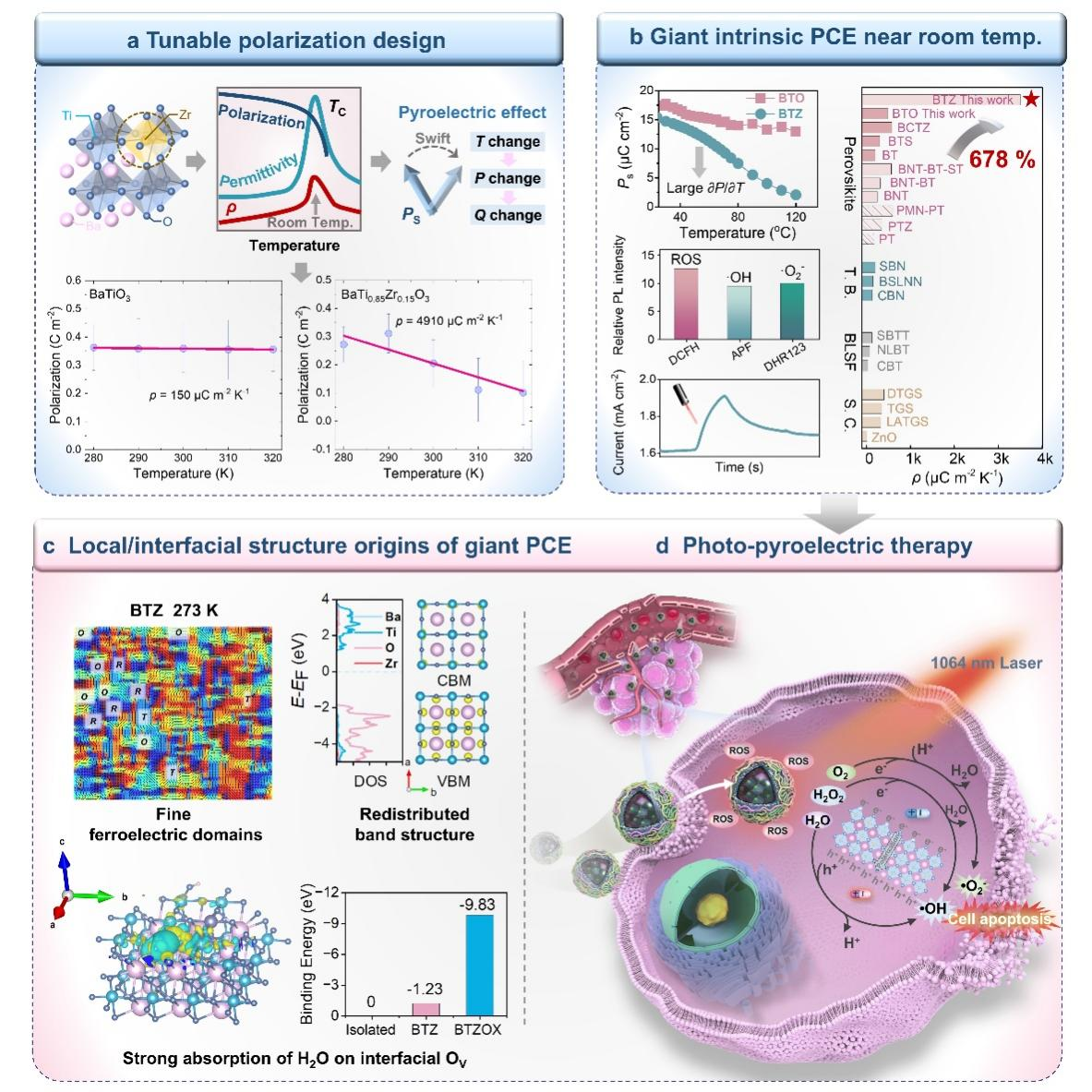 热释电催化技术通过利用环境温度波动产生的热释电电荷来驱动表面电化学反应,在可持续能源和肿瘤治疗等领域具有广阔前景,但其实际应用长期受限于两大瓶颈:一是材料本身的热释电系数较低,导致热-电转换效率不足;二是界面反应活性差,难以高效产生活性氧物种(ROS),从而限制了其治疗效果。