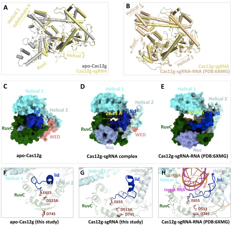 CRISPR-Cas (clustered regularly interspaced short palindromic repeats) 系统是细菌体内的获得性免疫系统,用于抵抗外源核酸物质的侵染。第二大类CRISPR-Cas系统仅需单个Cas效应蛋白即可完成对外源DNA或RNA的降解,因此可以广泛用于核酸编辑工作。2019年,研究者鉴定并报道了多种新型的第二大类V型Cas12家族的效应蛋白,Cas12g是其中仅有的具备核糖核酸酶 (RNase) 活性的效应蛋白 (Yan et al., Science, 2019)。在以往研究中,Cas12家族的效应蛋白均通过保守的RuvC核酸酶结构域靶向切割DNA,而Cas12g的发现打开了一个新的可能性,即使用Cas12g作为一种高效的RNA编辑工具。因此,揭示Cas12g蛋白如何被靶核酸激活并发挥其RNase活性的分子机制可为今后应用与改造CRISPR-Cas12g系统提供理论依据。尽管此前畅磊福研究团队已报道Cas12g与靶核酸形成复合物的结构与功能研究 (Li et al., Nature Chemical Biology, 2021),但Cas12g蛋白是如何被激活并切割靶核酸底物仍存在一些尚未研究清楚的问题。 近日,福建师范大学欧阳松应教授团队在PLoS Genetics上在线发表了题为 Structural transitions upon guide RNA binding and their importance in Cas12g-mediated RNA cleavage 的研究论文,深入分析了Cas12g蛋白结合sgRNA前后的构象变化及切割RNA底物的分子机制,为应用Cas12g开展RNA编辑工作提供了新的理论指导。
