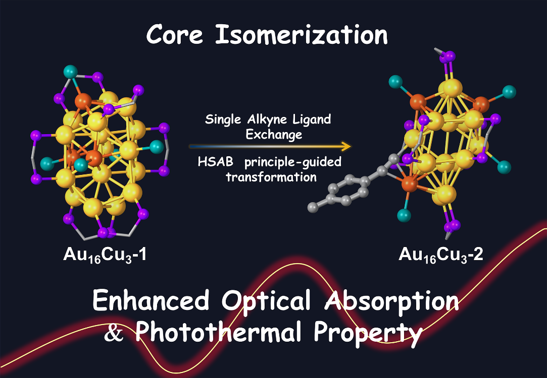 相关研究成果以“A Single Alkyne-Induced Core Isomerism in AuCu Clusters and Its Impact on Electronic Structure and Photothermal Response”为题,在线发表在化学综合类国际顶级期刊——《Angewandte Chemie International Edition》(中科院一区,TOP期刊)上,并被期刊编辑遴选为热点论文(Hot Paper)。