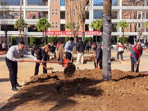 3月13日,校文明办、后勤党委、化学与材料学院、数学与统计学院、物理与能源学院相关领导及化学与材料学院学生代表40余人,参加了“播种绿意,共赴春光”2026年师生义务植树活动。师生们在理工楼前广场共同种下蓝花楹,为校园增添勃勃生机。[宣传部(文明办) 后勤管理处、后勤服务集团]