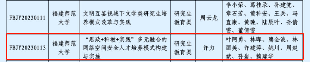 近日,福建省教育厅公布了2023年福建省高校教育教学研究项目立项名单。计算机与网络空间安全学院许力教授领衔申报的项目“‘思政+科教+实践’多元融合的网络空间安全人才培养模式构建与实施”荣获重大项目立项。此次我校共获2项教育教学研究项目(重大项目)研究生教育类立项。(计算机与网络空间安全学院)