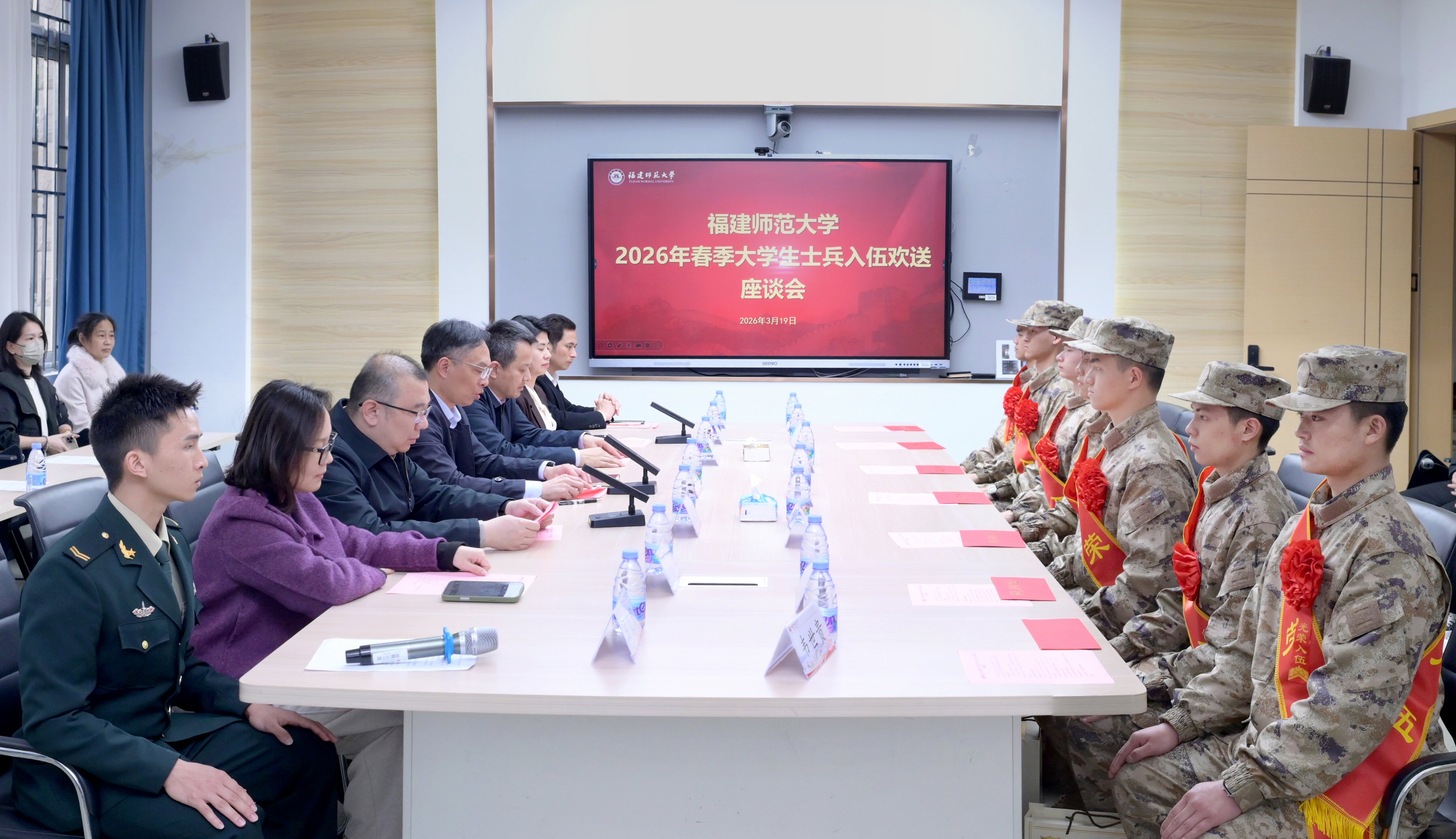 会议于3月19日在仓山校区举行。副校长陈晓斌,学生工作部、武装部主要负责人,2026年春季入伍大学生士兵、所在学院分管学生工作负责人、辅导员、2026年春季退役大学生士兵代表、新兵家长代表等参加欢送座谈会。