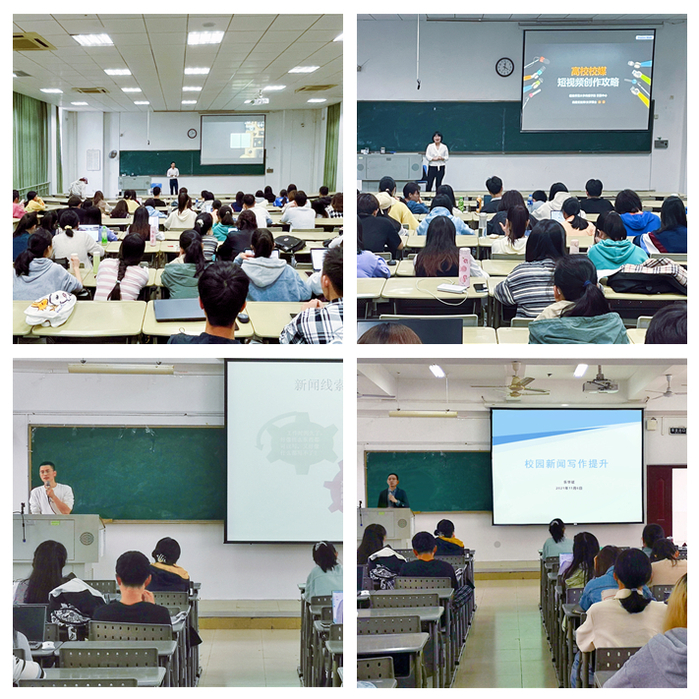 吴文刚为同学们讲述了自己拍摄校园风景图背后的故事,分享了摄影工作的经验和心得,总结了校园新闻摄影在取材、构图、后期方面的注意事项。他建议同学们在平时生活中多加练习,不仅提升拍摄技巧,更学会“让照片说故事”。施蕾以《高校校媒短视频创作攻略》为题,介绍了优秀的网络短视频案例,并对短视频的类型、制作思路、拍摄工具进行了详细的分析和解读,并结合我校实际,提出5G时代高校如何创作好富有特色的短视频的相关建议。乐华斌以正在举行的校运会导入,结合学校网页新闻和校报报道的案例,细致讲解了常用新闻体裁“消息”和“通讯”的含义、破题和导语的写法,并对如何做好校园新闻选题提供了若干建议。程枝文以《小故事如何变成大新闻》为主题,告诉同学们“做好新闻采写,有规律和方法”,建议同学们要注重新闻敏感性的培养,并通过“找变化、找感动、找节点亮点难点”,选择好角度,挖掘好题材,“润物细无声”地说好校园新闻故事。