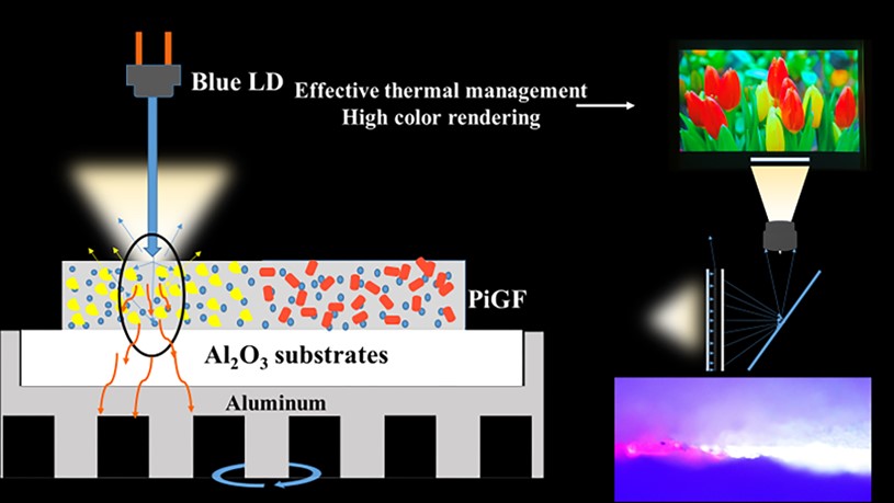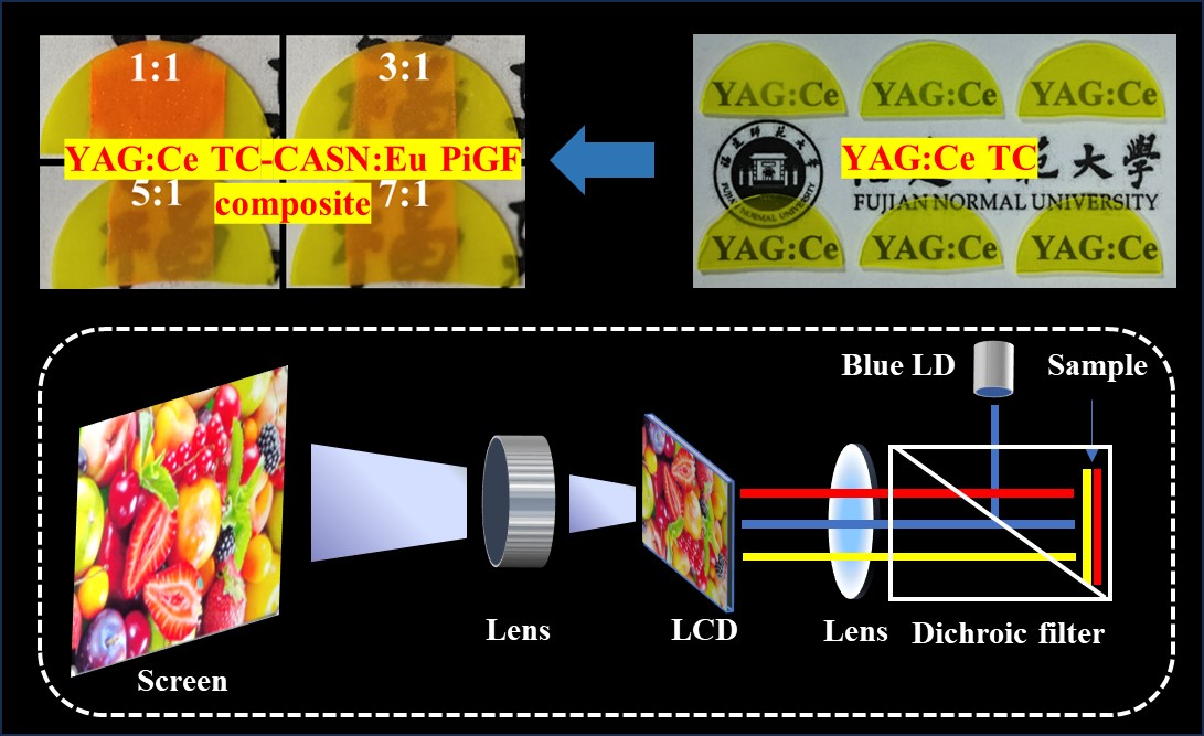 进一步地,课题组提出将红光发射CASN: Eu荧光粉与玻璃混合后共烧于YAG: Ce透明陶瓷上,获得CASN: Eu - YAG: Ce复合转光材料。该设计巧妙地利用透明陶瓷既作为发光层,又作为高导热衬底,使得CASN: Eu荧光玻璃陶瓷薄膜也保持了优异的发光性能。此外,红光成分补偿使得基于复合材料的白光显色指数得到明显提升,获得了超高亮度、高品质激光驱动白光光源。基于复合材料构建了激光投影显示原型器件,验证了转光材料在投影显示领域的应用可行性。研究成果以Novel Color Converters for High Brightness Laser-Driven Projection Display: Transparent Ceramics - Glass Ceramics Film Composite为题发表于Advanced Functional Materials。论文第一单位为福建师范大学,硕士研究生廖盛祥、博士研究生金世林为共同第一作者,林世盛博士和陈大钦教授为本文共同通讯作者。