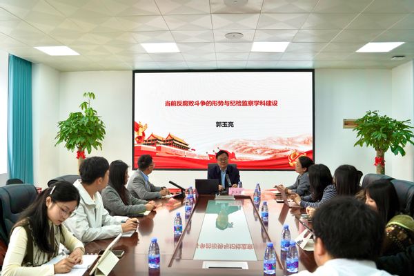 郭玉亮以“当前反腐败斗争的形势与纪检监察学科建设”为题,回顾了党的十八大以来党风廉政建设和反腐败斗争的伟大历程和取得的历史性成就,深刻分析了当前反腐败斗争形势和任务。他还系统梳理了纪检监察学科从萌芽到建立历程,展望纪检监察学科发展未来,教育引导学生立志成为纪检监察高素质专业化人才。