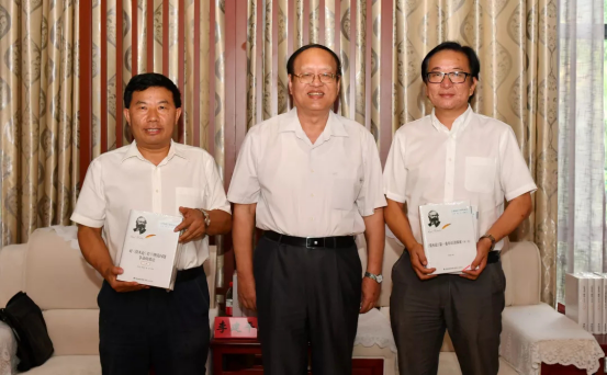 李建平教授向贵州大学党委书记李建军(右一)、党委副书记骆长江(左一)赠书