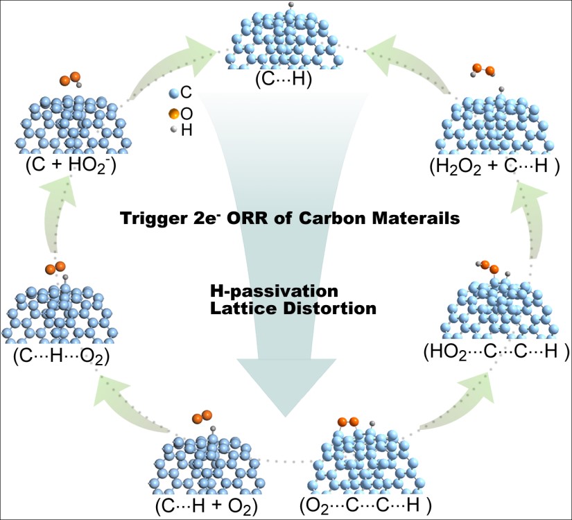 基于此,我校林良旭教授团队以碳布材料为研究对象,通过设计一种由氢原子钝化的晶格扭曲结构,实现了高效、稳定和高选择性两电子ORR反应,系统阐述了碳材料晶格扭曲和氢钝化在电催化活化上和选择性调控中的关键作用,为碳材料的ORR催化机理机制提供了新的理解,并为进一步阐述碳材料的ORR催化活化机制提供新的强有力的依据。该研究所阐述的催化活化机制是对碳材料ORR催化机理的有力补充,也解释了为什么碳材料在ORR中所表现出的诸多难以理解的实验现象,为更精准的催化电极设计提供参考和依据。相关研究成果以“Lattice Distortion and H-passivation in Pure Carbon Electrocatalysts for Efficient and Stable Two-electron Oxygen Reduction to H2O2”为题发表在国际知名期刊Angewandte Chemie International Edition。