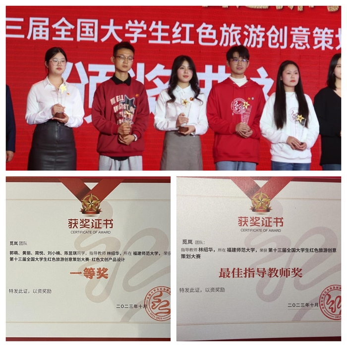 近日,第十三届全国大学生红色旅游创意策划大赛决赛在辽宁省丹东市举行。我校文化旅游与公共管理学院“觅岚”队在比赛中表现优异,喜获一等奖,林绍华老师荣获“最佳指导教师”称号。据悉,本届大赛以“激扬青春梦 奋进新时代”为主题,吸引了来自全国676所高校的4706支队伍共2.8万名师生报名参赛,经过激烈角逐,60支队伍入围全国总决赛。(文化旅游与公共管理学院)