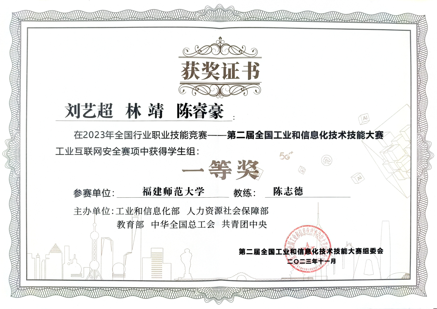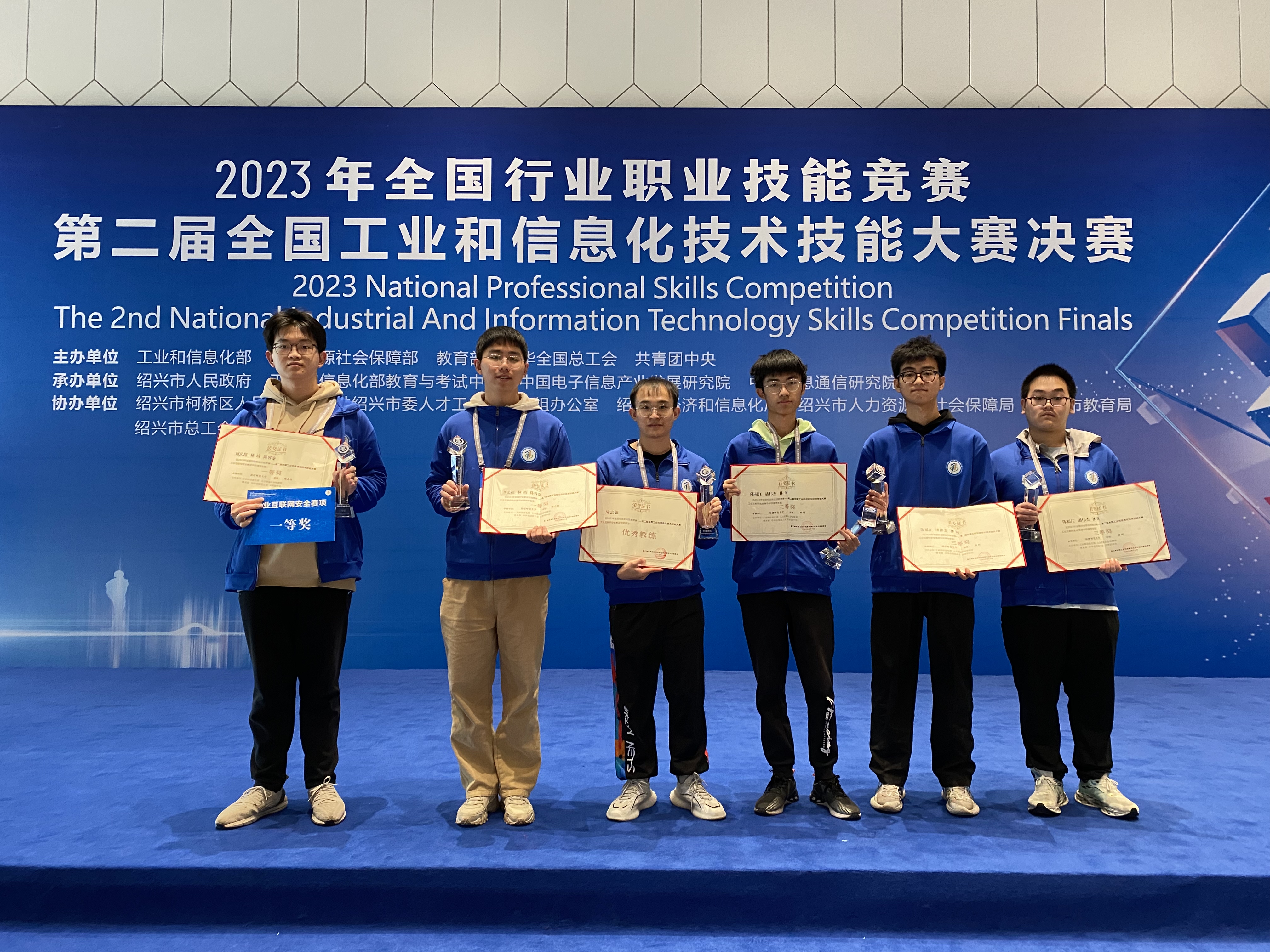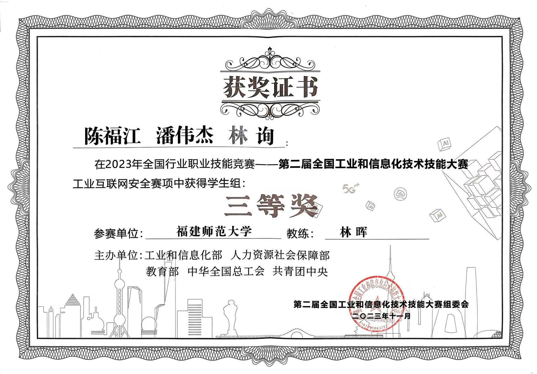 近日,2023年全国行业职业技能竞赛——第二届全国工业和信息化技术技能大赛决赛在浙江省绍兴市举办。经过激烈角逐,计算机与网络空间安全学院学生刘艺超、林靖和陈睿豪(物理与能源学院)获“工业互联网安全赛项”学生组一等奖,陈福江、潘伟杰、林询获三等奖,陈志德教授荣获“优秀教练”称号。