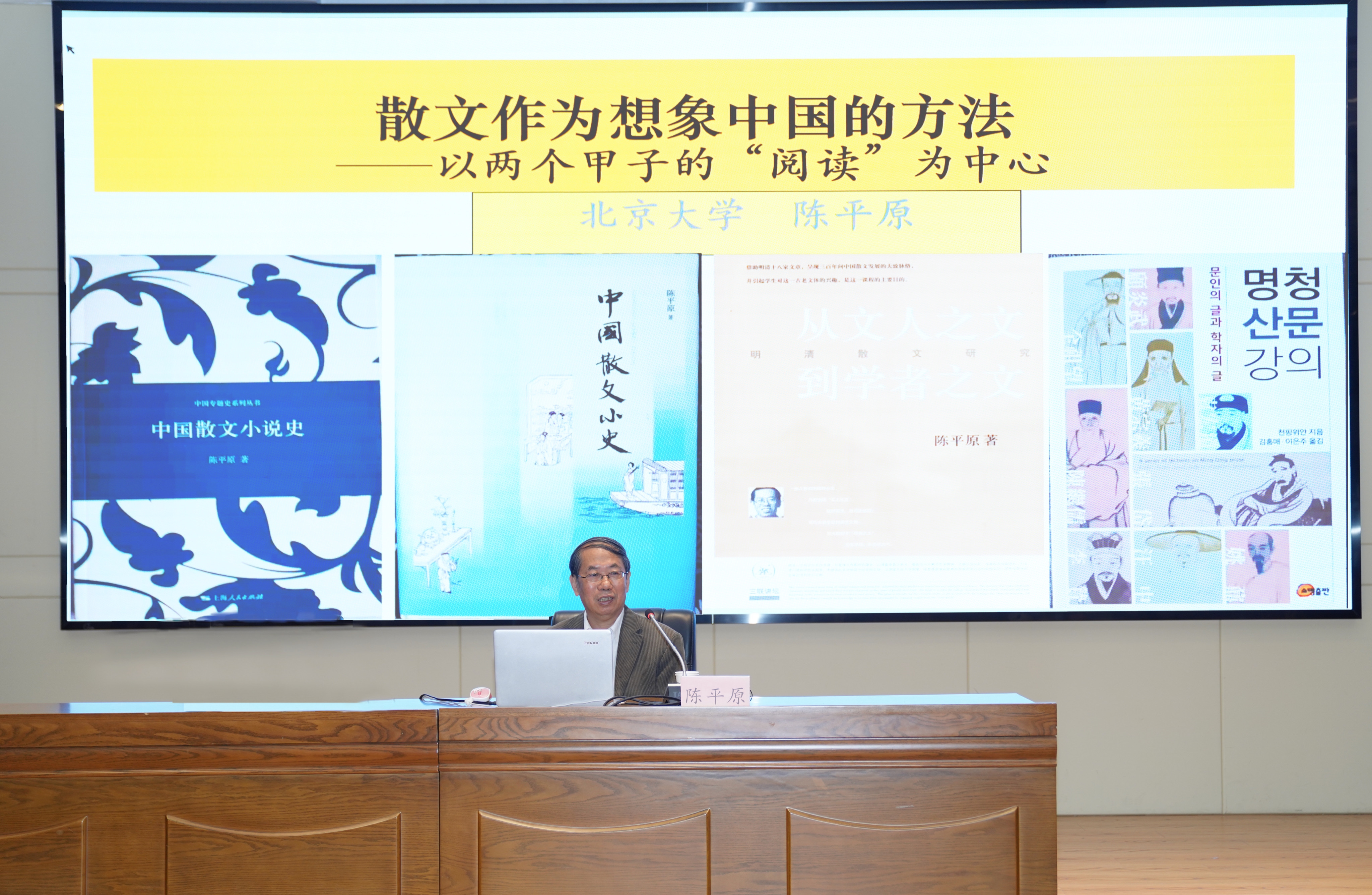 11月20日,北京大学博雅讲席教授、教育部“长江学者”特聘教授、中央文史研究馆馆员陈平原先生来校作题为“散文作为想象中国的方法——以两个甲子的阅读为中心”的学术讲座。讲座由我校副校长郑家建主持,文学院师生共计300余人参加。