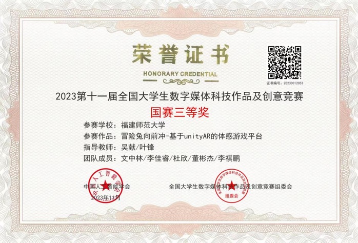 据悉,该比赛由中国人工智能学会、全国大学生数字媒体科技作品及创意竞赛组委会主办,中国人工智能学会科普工作委员会、中国计算机学会虚拟现实与可视化专委会协办,入选2023年教育部高等教育教学学会大学生学科竞赛排行榜单。