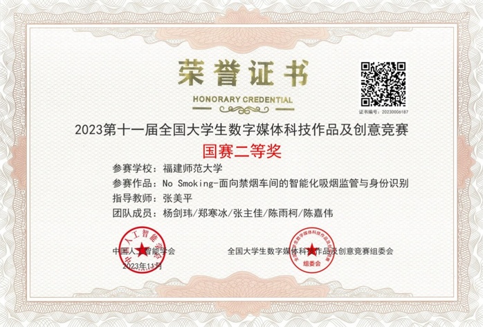 近日,第十一届全国大学生数字媒体科技作品及创意竞赛总决赛在江苏理工学院举行。我校计算机与网络空间安全学院学生杨剑玮、郑寒冰、张主佳、陈雨柯、陈嘉伟的智能软硬件创意类作品《No Smoking——面向禁烟车间的智能化吸烟监管与身份识别》获二等奖(指导老师:张美平),文中林、李佳睿、杜欣、董彬杰、李祺鹏的虚拟现实与游戏类作品《冒险兔向前冲——基于unityAR的体感游戏平台》获三等奖(指导老师:吴献、叶锋)。