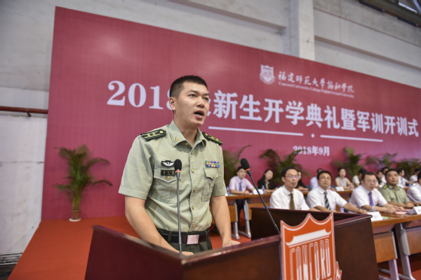 中国人民解放军31612部队副参谋长吴小舟中校作为军训教官代表、文化产业系副教授殷晓云作为教师代表、学院学生会负责人李辉同学作为老生代表、外语系2018级英语专业闫嘉琪作为新生代表分别发言。