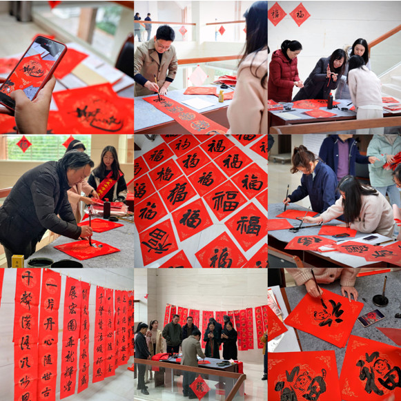 活动吸引了众多老师参与,现场其乐融融。大家驻足品赏、相互交流,挑选自己喜欢满意的书法作品,人人脸上洋溢着幸福笑容。活动期间,校领导王长平、陈晓红、郑家建、涂荣先后来到现场,与师生互送祝福。当天,师生共创作送出500多副春联和福文化创意作品。