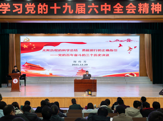 郑传芳教授以《光辉历程的科学总结 勇毅前行的正确指引一一党的百年奋斗的三个历史决议》为题,深刻阐述了党在百年奋斗光辉历程中制定的三个历史决议,其中重点围绕党的十九届六中全会通过的《中共中央关于党的百年奋斗重大成就和历史经验的决议》,对全会精神进行了集中阐释和系统讲解。整场报告站位高远、主题鲜明、重点突出、内容丰富,既有思想高度,又有理论深度、实践厚度,具有很强的理论性、思想性和启迪性,对老师们进一步深入学习领会党的十九届六中全会的精神实质和深刻内涵具有很好的指导作用。