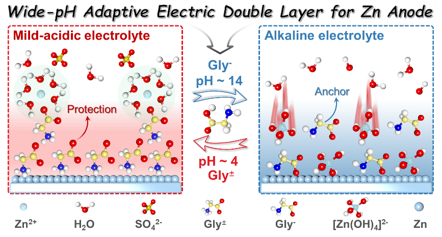 近日,我校环境与资源学院陈庆华教授、曾令兴教授与德国德累斯顿大学熊佩勋博士联合研究一种甘氨酸(Gly)添加剂电离调控的宽pH自适应双电层(EDL),并深入阐明了添加剂浓度对锌电极表面亥姆霍兹内层(IHP)结构的调节作用,解决了锌负极在宽pH范围和宽温域下稳定性差的问题。