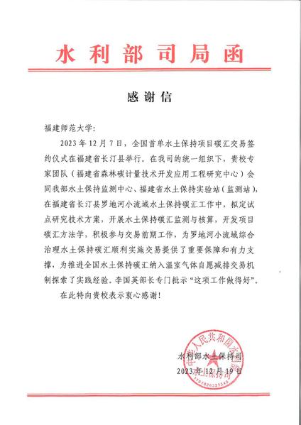 日前,水利部水土保持司致信我校,对我校专家团队(福建省森林碳计量技术开发应用工程研究中心)全方位参与全国首个水土保持项目碳汇开发工作表示感谢,认为该项工作为全国首单水土保持项目碳汇交易(罗地河小流域综合治理水土保持碳汇项目)的顺利实施提供了重要保障和有力支撑,为推进全国水土保持碳汇纳入温室气体自愿减排交易机制探索了实践经验。信中特别指出,该项工作得到水利部部长李国英同志专门批示“这项工作做得好”。(地理科学学院)
