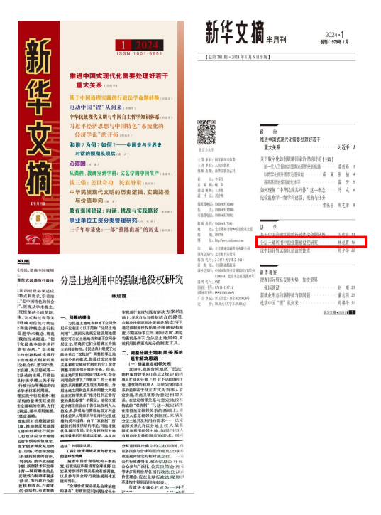 我校法学院、纪检监察学院林旭霞教授发表在《中国法学》2023年第5期的学术论文《分层土地利用中的强制地役权研究》,被国家权威刊物《新华文摘》2024年第1期大篇幅转载,字数7000余字。