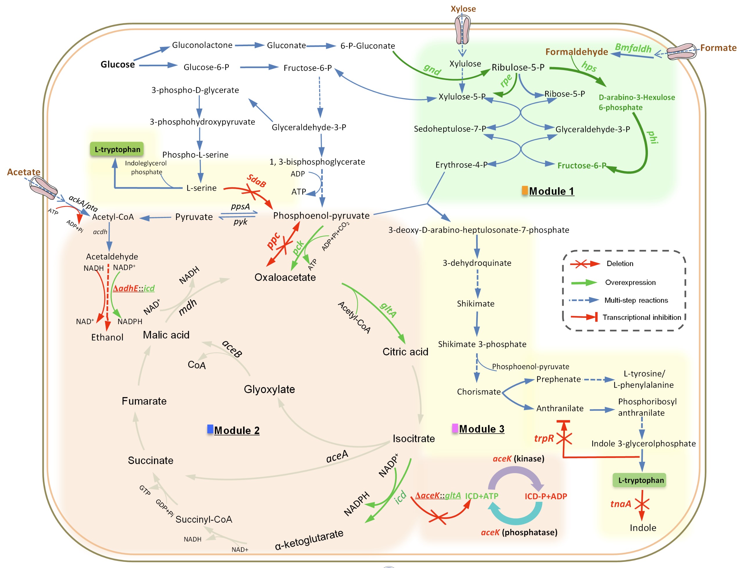 近日,我校生命科学学院工业微生物教育部工程研究中心祁峰教授课题组在在重组大肠杆菌胞内引入外源来自Burkholderia multivorans的甲醛脱氢酶(BumFaldDH)和5-磷酸核酮糖(RuMP)途径,同时通过代谢工程改造,强化细胞内必要的辅因子NADPH和ATP的自我供给,实现了重组大肠杆菌对于较高浓度甲酸盐的同化并增强了细胞对于乙酸盐的同化。将这种低碳化合物同化策略整合到另一株高产L-色氨酸的重组大肠杆菌中,重组菌显示出对高浓度甲酸盐和乙酸盐同化效率的显著提升,同时在摇瓶培养中L-色氨酸的产量达到0.38 g/gDCW。这项工作为优化利用木质纤维素水解产物作为碳源合成高附加值目标化合物提供了研究依据。相关研究成果以题目为“Integrated and enhanced coassimilation of formate and acetate for efficient utilization of lignocellulosic hydrolysate” 发表于《ACS Sustainable Chemistry & Engineering》。