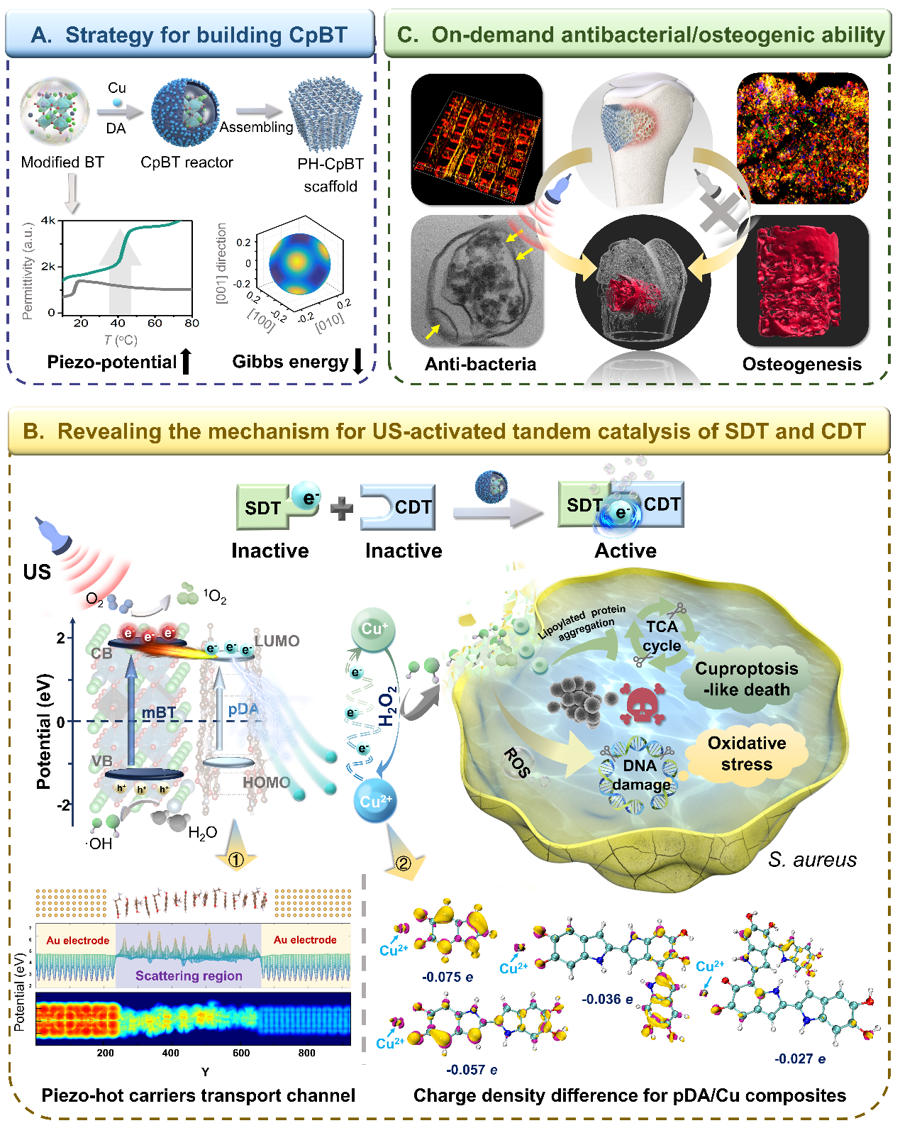 近日,我校光电与信息工程学院张先增教授团队基于前期对压电声敏剂的超声-压电调控机理的工作(Adv. Func. Mater., 2023, 33: 2210726),进一步提出了一种超声激发的压电智能纳米反应器。该纳米反应器通过超声触发的时空串联催化,提升了声动力疗法和化学动力疗法对骨植入物细菌感染的治疗效果。该纳米反应器利用高性能压电钛酸钡、聚多巴胺和铜离子的巧妙配合,使超声激活的压电热载流子经聚多巴胺“电子通道”转移到铜上。这不仅促进了压电声动力活性氧物质的生成,还调节了Cu2+和Cu+之间的价态转换,从而触发Cu+催化的类芬顿反应,促进羟基自由基的生成,导致细菌膜结构松弛和DNA损伤。将该纳米反应器负载在3D打印聚醚酮酮骨植入支架表面,在医用超声作用下表现出优异的抗菌性能,同时在体内促进了植入体周围血管生成和骨生成,展现出了极佳的临床应用潜力。该策略有望为植入物提供超声可调控的抗菌和促骨能力,为治疗植入体感染提供一种新思路。