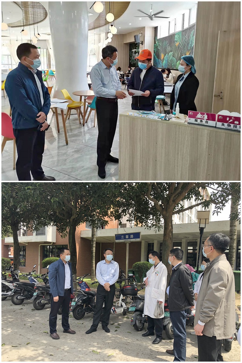 潘玉腾一行实地走访了核酸检测点、食堂、快递中心、健康观察点,检查疫情防控措施落实情况,强调要严格按照上级、属地和学校的部署要求,突出快准严实细要求,做到科学精准防控;要强化健康管理,组织好师生员工核酸检测工作,抓好采、送、检、报各环节衔接,确保安全、有序、高效;要落实食堂工作人员晨午检制度,落实食品原料采购索证、验收、台账记录制度,确保食材源头安全;要高度重视并做好校园快件涉疫风险防控工作,采取有效措施、运用技术手段,切实堵住疫情通过物件渠道传入校园;要完善健康观察点工作流程,切实提高管理服务能力,全力筑牢健康观察点防控安全线。
