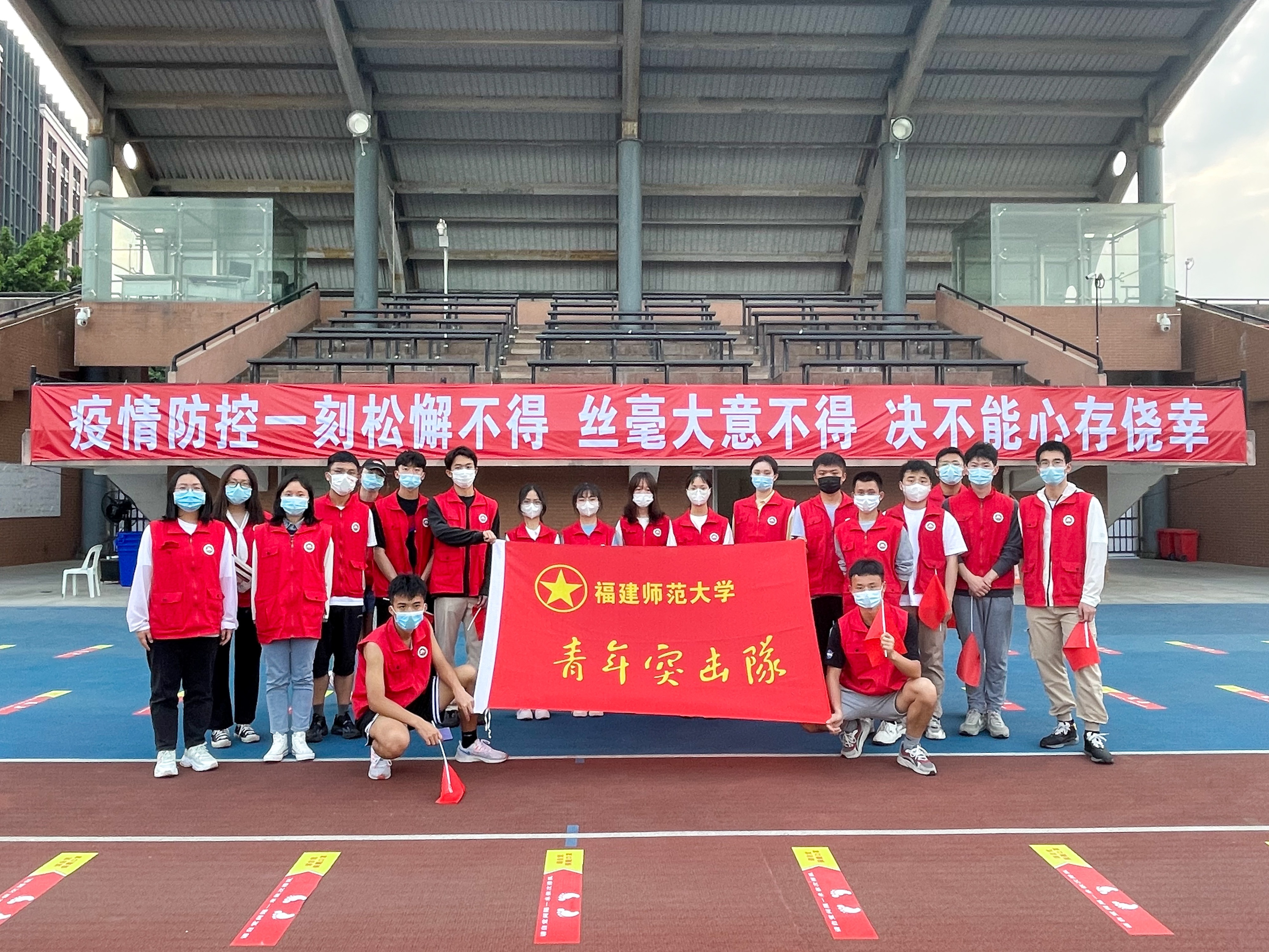 校团委党支部组织仓山、旗山两个校区学生志愿者584人成立核酸检测外围引导分队,在核酸检测外围现场,协助三轮全员核酸检测工作。志愿者们统一着装,引导同学有序排队,控制检测人数,严格保持一米距离,对有序、顺利、高效地开展全员核酸工作检测发挥了重要作用。防疫督导分队招募志愿者1800人,分布于校内大型室内公共场所;心理援助分队(心理防疫突击队)76名成员在岗,开通心理支持热线和网络心理咨询公益服务;后勤保障分队协助隔离师生提供送餐、购买生活物资等后勤保障服务;体温监测分队不间断实现全校学生宿舍楼常态化体温监测全覆盖。同时,还开展疫情防控储备志愿者,一天之内,学校学生迅速响应,积极报名。校青年志愿者工作中心联合校医院对上岗的学生志愿者针对现场测温、引导、口罩佩戴等问题开展岗前培训。