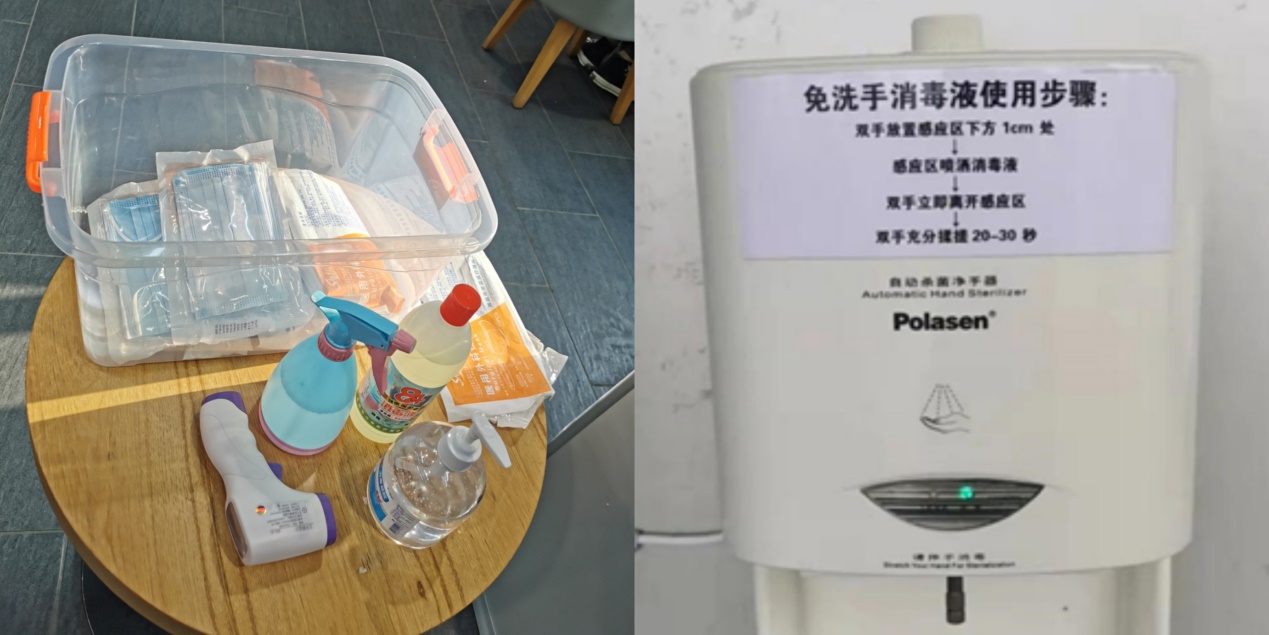 随时随地,杀菌自净。校内公寓楼大厅、餐厅、商超、快递服务点等场所门口均配备免水洗手液、自动灭菌净手器等消毒物品。