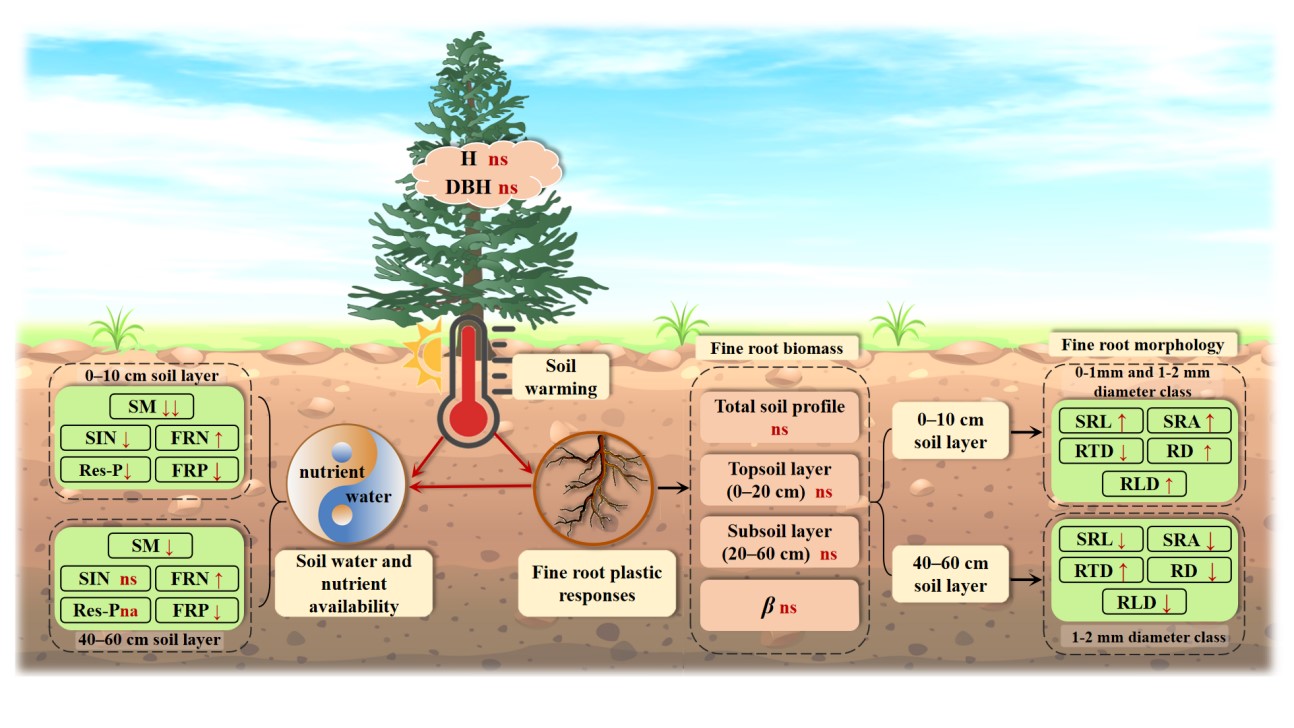 在森林生态系统中,气候变暖引起的表层土壤干旱可能会扩大土壤剖面上水分和养分之间的空间失配,根系在土壤剖面上的可塑性是林木应对这种水养空间解耦的重要生态策略。然而,增温下不同土层林木根系的塑性响应很少被研究,这阻碍了有关林木如何协调土壤剖面上水分和养分资源获取的全面理解。