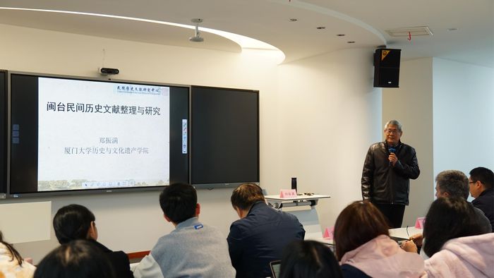 郑振满教授长期致力于民间历史文献研究,拥有丰富的田野调查经验。讲座中,他以《闽台民间历史文献整理与研究》为题,阐述了闽台民间历史文献发掘与研究的现状,指出福建未来的研究重点之一将是福建祖地文化。郑教授强调,闽台两地的民间文书研究,不仅需要“地毯式”搜索相关文书资料、留下碑刻影像,还要进行两岸文书资料的对接。