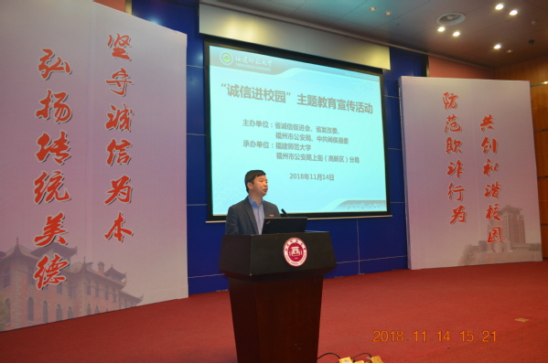 11月14日下午,由省诚信促进会、省发改委、福州市公安局、中共闽侯县委等单位联合主办,我校和福州市公安局上街(高新区)分局共同承办的“诚信进校园”主题教育宣传活动在旗山校区图书馆学术大讲堂举行。主、承办单位领导和相关部门负责同志以及我校师生代表500余人参加了活动。活动由省诚信促进会常务副会长林鸿坚主持。