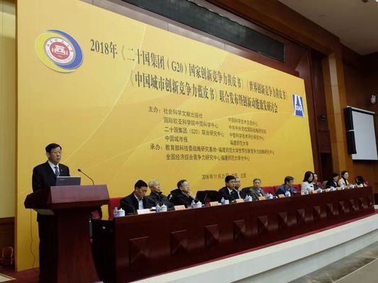 11月21日,由我校和科技部中国科学技术交流中心、国际欧亚科学院中国科学中心、中共中央党校国际战略研究院、二十国集团(G20)联合研究中心、中国城市报、中智科学技术评价研究中心、社会科学文献出版社联合主办的“2018年《二十国集团(G20)国家创新竞争力黄皮书》《世界创新竞争力黄皮书》《中国城市创新竞争力蓝皮书》联合发布暨创新动能激发研讨会”在中国社会科学院举行。中国社会科学院副院长蔡昉,国务院发展研究中心原副主任、中国农村劳动力资源开发研究会会长卢中原,国际欧亚科学院院士、中国科学中心秘书长、国家科技部二级专技赵新力,中国社会科学院数量经济技术经济研究所党委书记李富强,中央党校国际战略研究院原副院长周天勇,世界知识产权组织中国办事处业务主管张俊琴,中国国际经济交流中心信息部副部长王晓红,国际欧亚科学院中国科学中心执行秘书长刘洪海,科技部国家科技评估中心曹伟晓,人民日报中国城市报记者部主任张阿嫱,光明日报理论部原主任李向军,中国发展网总编辑卢必成,中国社会科学院信息情报研究院经济室主任卓丽洪,中国农村劳动力资源开发研究会秘书长苏宏文,中智科学技术评价研究中心理事长、我校兼职教授李闽榕,我校经济学院负责人等出席了会议。