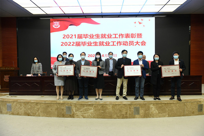 会议表彰了2021年毕业生就业工作先进集体和先进个人,颁发了奖牌和奖状。外语系主任张昌宋、信息技术系辅导员王思涵作为获奖代表作了经验交流。