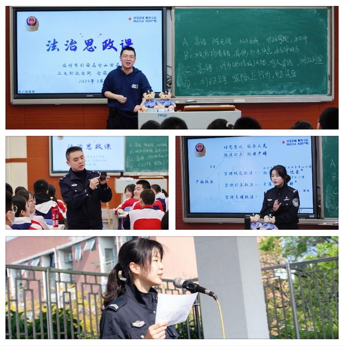 3月22日,仓前派出所民警叶维键、三叉街派出所民警吴瑾宣走进高一年级的思政课堂,将法治实践与展示融入法治理论教学,与思政教师陈懂共上《思想政治》必修三《严格执法》的课程内容。叶维键结合案例阐述了派出所民事调解程序,并通过实物展示介绍了常见警械的类别和使用方法;吴瑾宣用生动形象的语言,基于案例分析讲解了《民法典》颁布的重大意义。陈懂老师创设模拟场景,让同学们以表演重现居民纠纷的情景,引导同学们对违法行为进行辨析。课程结束后,民警们“趁热打铁”,以“警官熊”作为奖品开展了“安全大观园”有奖问答活动,同学们积极踊跃回答防校园欺凌、禁毒、网络安全等问题。