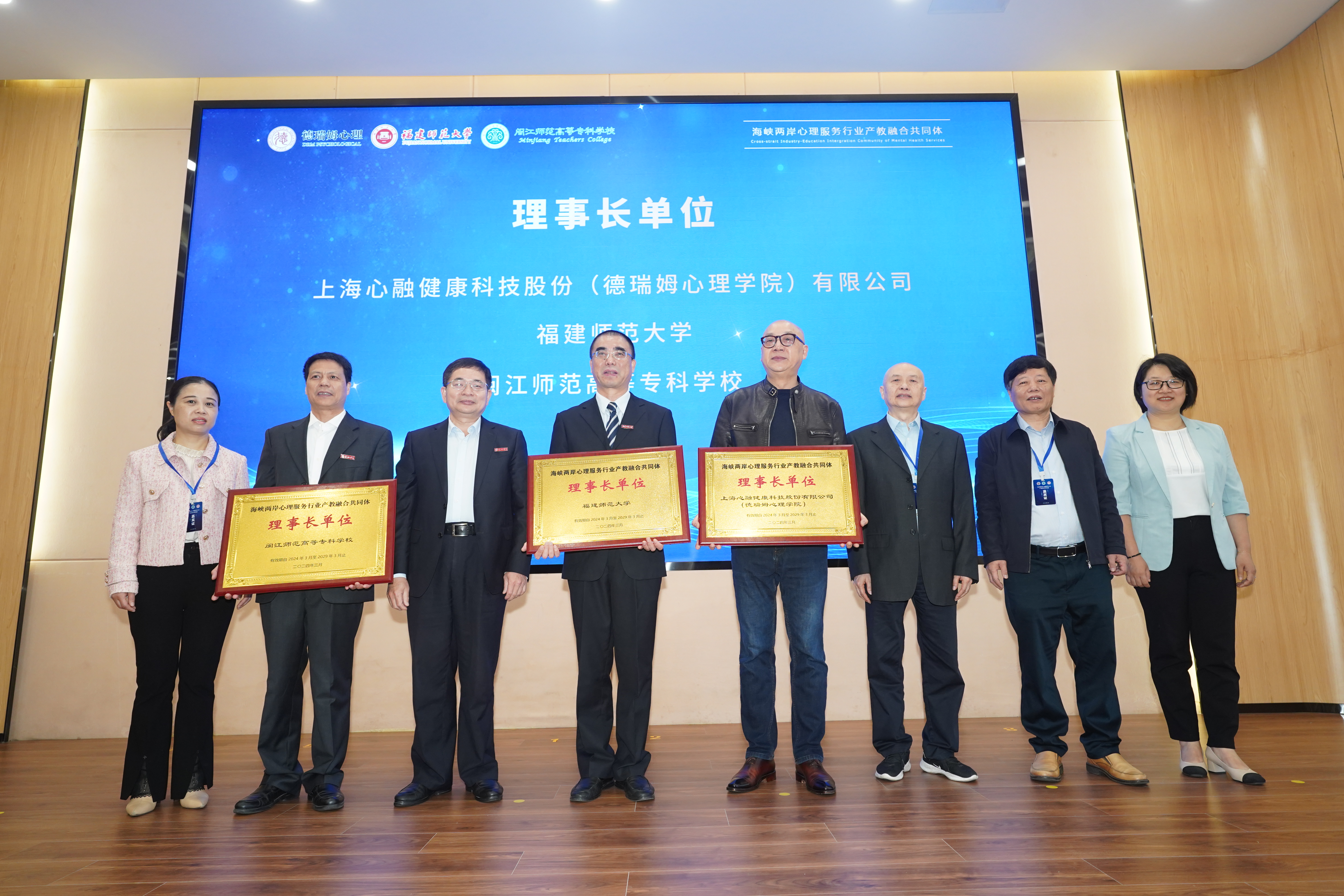 会议审议通过了共同体章程(草案)和共同体组织架构,福建师范大学、闽江师范高等专科学校、上海心融健康科技股份有限公司三家单位被确定为理事长单位,并隆重举行了海峡两岸心理服务行业产教融合共同体启动及授牌仪式。
