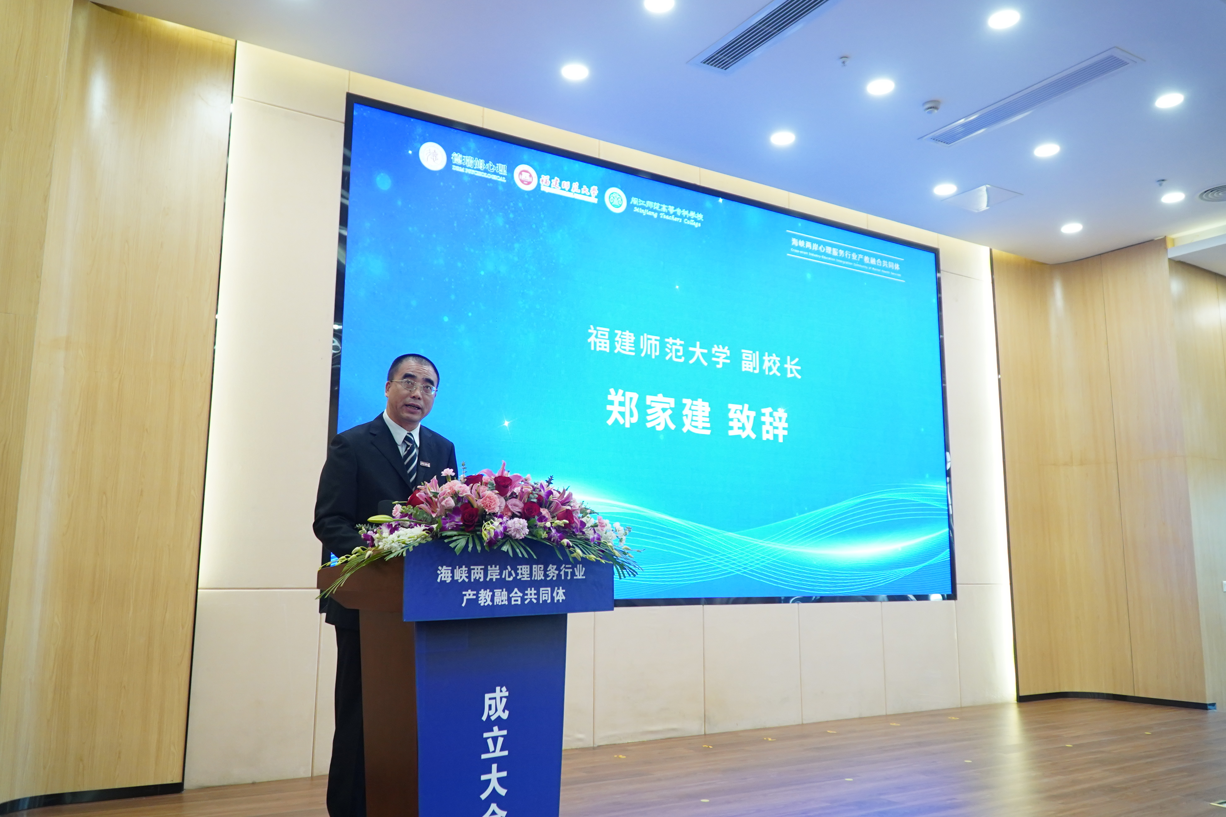 郑家建在致辞中指出,共同体由我校与闽江师范高等专科学校、上海心融健康科技股份(德瑞姆心理学院)有限公司牵头,联合全国相关行业组织、本科院校、职业院校、科研机构和企事业单位等自愿组成的非独立法人组织,首批共同体成员单位覆盖海峡两岸98家心理服务相关单位。他表示,成立海峡两岸心理服务行业产教融合共同体,是贯彻落实中共中央、国务院《关于支持福建探索海峡两岸融合发展新路 建设两岸融合发展示范区的意见》的务实举措,是一次跨行业、跨领域、跨地域的大胆尝试,也是践行“两岸一家亲”理念的生动实践,对于推动心理服务产业链、供应链、教育链深度融合和有机衔接,健全和完善社会心理健康和精神卫生服务,深化海峡两岸心理服务领域融合发展,具有重要意义。