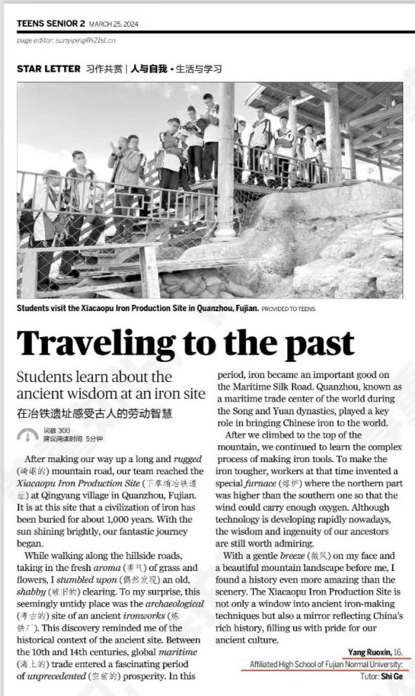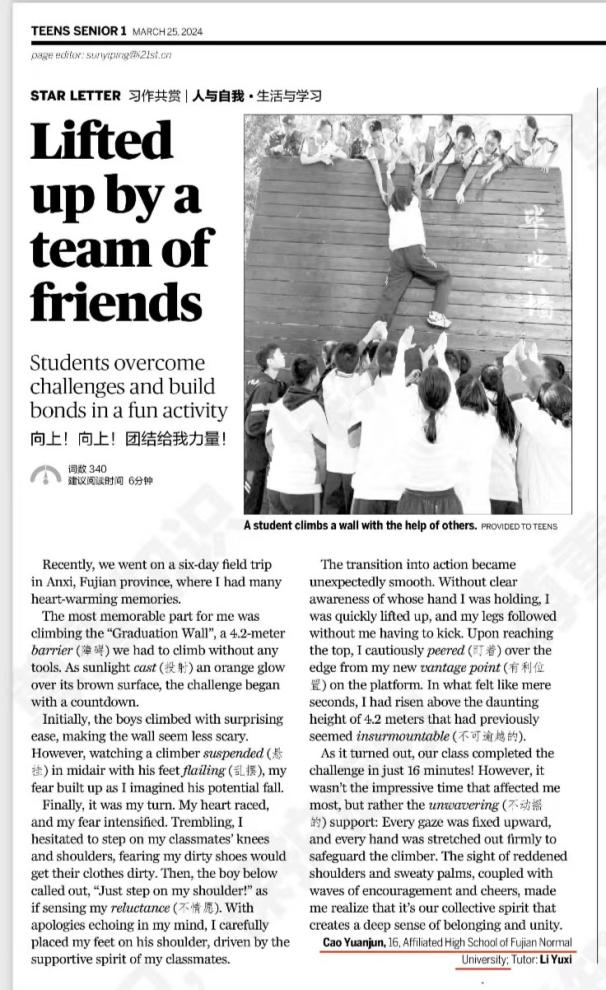 近日,《中国日报•二十一世纪学生英文报》刊发我校附中高二年级学子曹袁珺、杨若欣的两篇英文文章,文中生动描述了附中在泉州安溪开展“行走的思政课”研学实践活动的体验和感悟,展现附中落实学科思政的育人成果。