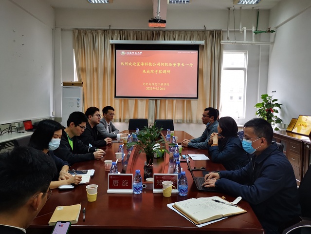 近日,星海科技公司董事长何凯伦、总工程师赵浩瀚、总裁助理郑声琛、廖银亮、唐璇一行到光电与信息工程学院考察调研。副院长(主持工作)张先增、教授级高工王敏、网通系副主任郑华、电子系苏伟达老师等参加了调研。