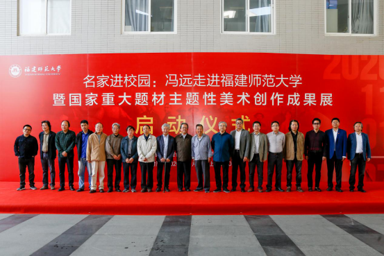 11月1日上午,由《中国美术报》、福建省文学艺术界联合会和我校联合主办“名家走进福建师范大学公益活动暨国家重大题材主题性美术创作成果展”顺利开幕。中国文学艺术界联合会副主席、中央文史研究馆副馆长、中国美术家协会名誉主席冯远,福建省文学艺术界联合会党组成员、书记处书记、福建省美术家协会主席王来文,中国国家画院理论所副所长陈明,中国国家画院人物所副所长卢志强,《中国美术报》事业发展部副主任李回源、编辑部副主任张婷婷,福建省艺术职业学院院长唐文忠,我校副校长赖海榕,福建省美术家协会名誉主席、美术学院教授翁振新,福建省民间文艺家协会主席、我校台湾美术研究中心主任李豫闽,福建省美术家协会驻会副主席赵胜利,福建省美术家协会副主席、福建省画院院长张永海,中国美协漆画委员会副主任、福建省美协副主席汤志义,福建省美术馆馆长丘志军,闽江学院美术学院院长郑鑫、副院长赖登云,以及美术学院党政负责人、师生代表共200余人参加开幕式。赖海榕、王来文、陈明先后在开幕式上致辞。
