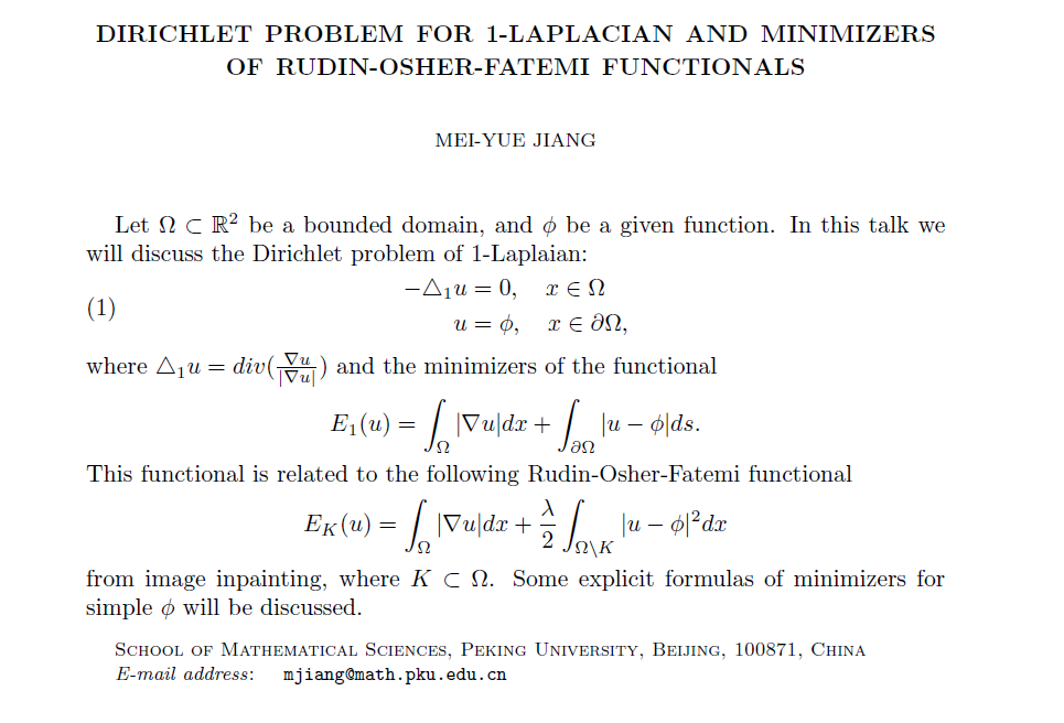 学术讲座【Dirichlet problem for 1-laplacian and minimizers of rudin-osher-fatemi functionals】