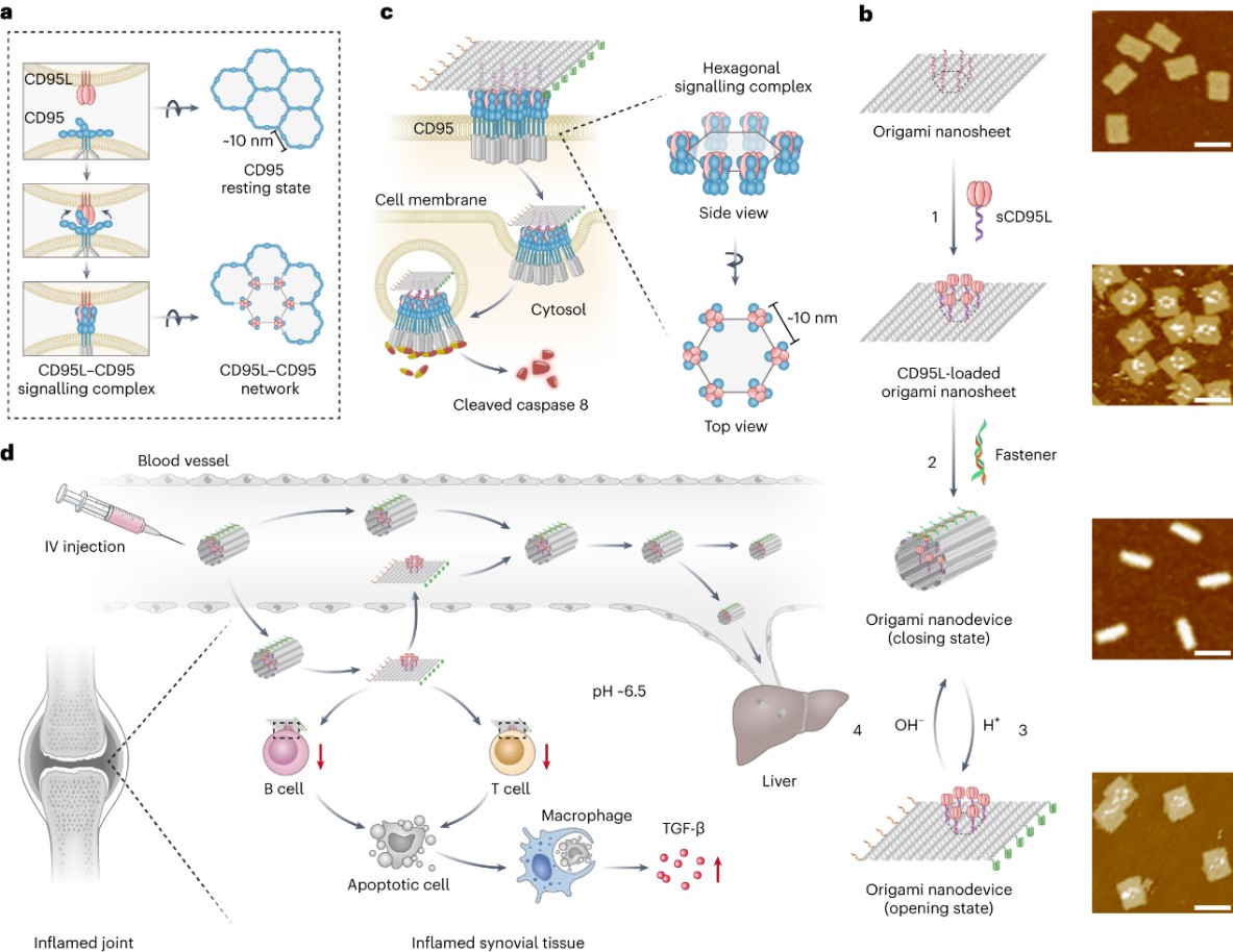 近日,我校杨震教授联合新加坡NUS陈小元教授、南京邮电大学晁洁教授、四川大学李玲教授团队,在国际顶尖期刊Nature Materials发表题为“A DNA origami device spatially controls CD95 signalling to induce immune tolerance in rheumatoid arthritis”的研究性论文。