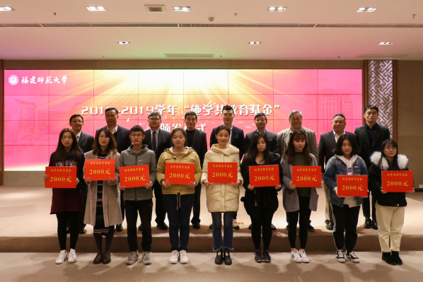 施教斌介绍了其先父施学共先生求学师大、开创事业、热心慈善的历程。勉励受奖助学生努力学习,攻坚克难,磨炼成才,把老一辈校友艰苦创业、乐善好施的精神传承下去,为国家和母校作出新的贡献。张丽婷同学作为学生代表发言,与会领导和嘉宾为学生颁发奖、助学金,并与学生合影留念。