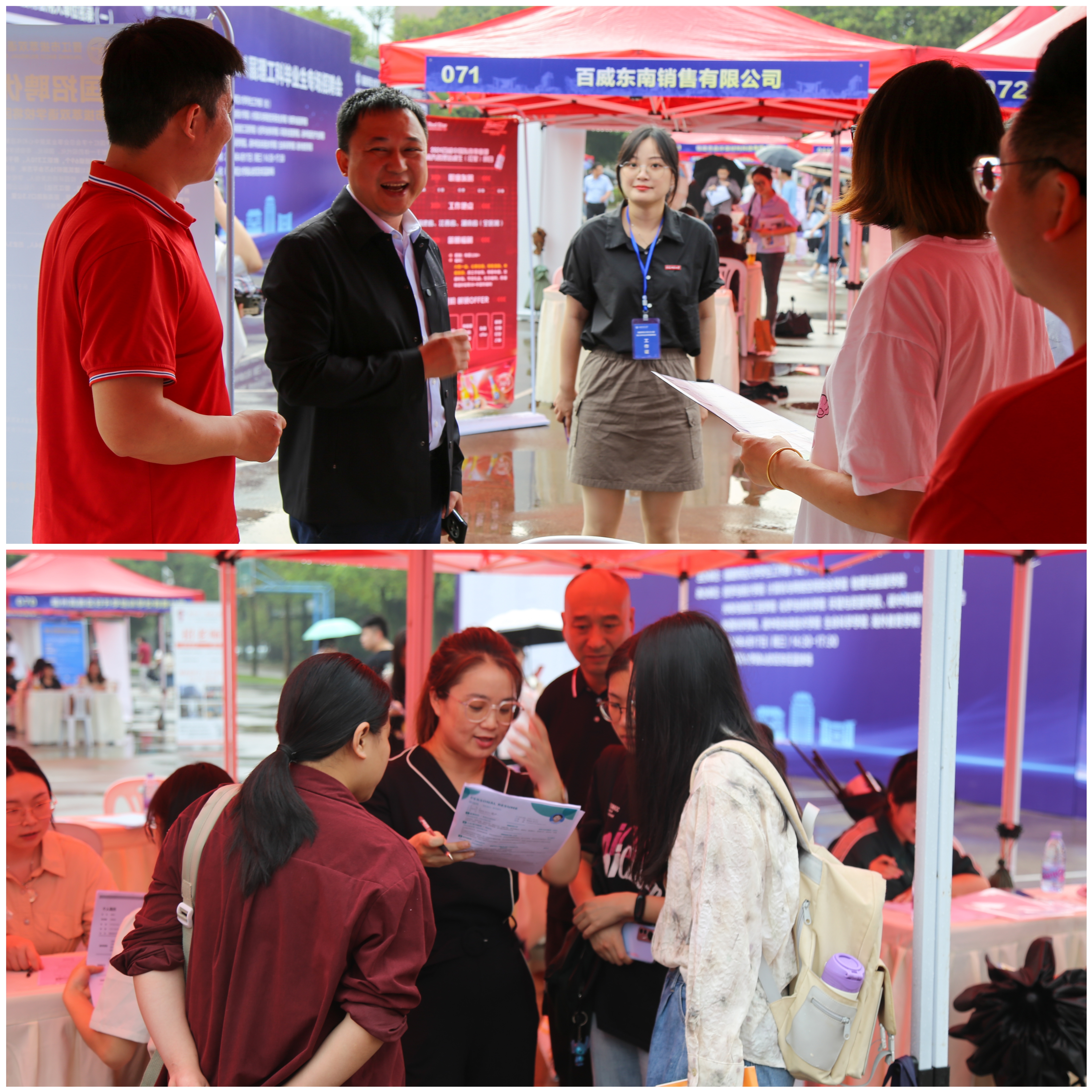 招聘会现场气氛热烈,瓢泼大雨也没有阻挡毕业生的求职热情,毕业生们手持精心制作的简历,积极与企业交流,了解用人单位的岗位要求、发展前景、福利待遇等,用人单位耐心解答毕业生提出的问题,并介绍了企业发展、工资待遇、职业发展前景等情况,用人单位接收简历并现场开展面试。