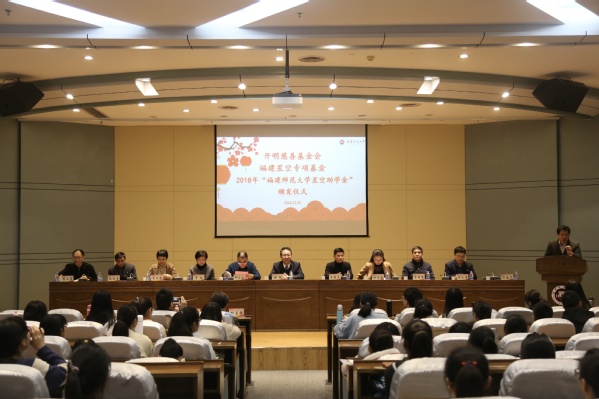2018年12月26日下午,开明慈善基金会福建星空专项基金、2018年度“福建师范大学星空助学金”颁发仪式在仓山校区举行。全国政协社会和法制委员会副主任、省文联主席、省社会科学院院长张帆,民进省委会秘书长林龙金,福建新思路集团有限公司董事长、福建民进经济界联谊会会长、校创新创业导师王东平,副校长郑家建和有关职能部门负责人、文学院党政负责人、受资助学生、师生代表参加了活动。
