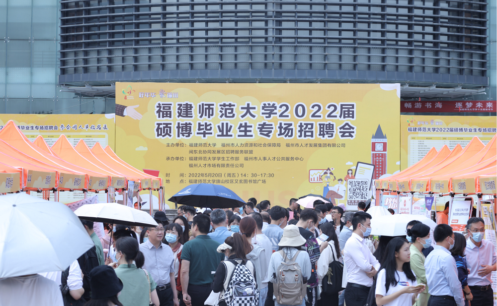 5月20日,由福州市人力资源和社会保障局、福州市人才发展集团有限公司和我校联合举办的“好年华 聚福州”福建师范大学2022届硕博毕业生专场招聘会在旗山校区又玄图书馆广场举行。福州市人力资源和社会保障局、福州市人才发展集团有限公司相关负责人,校领导潘玉腾、王长平、涂荣,学生工作部、各学院分管学生工作负责人,毕业班辅导员以及硕博毕业生参会。