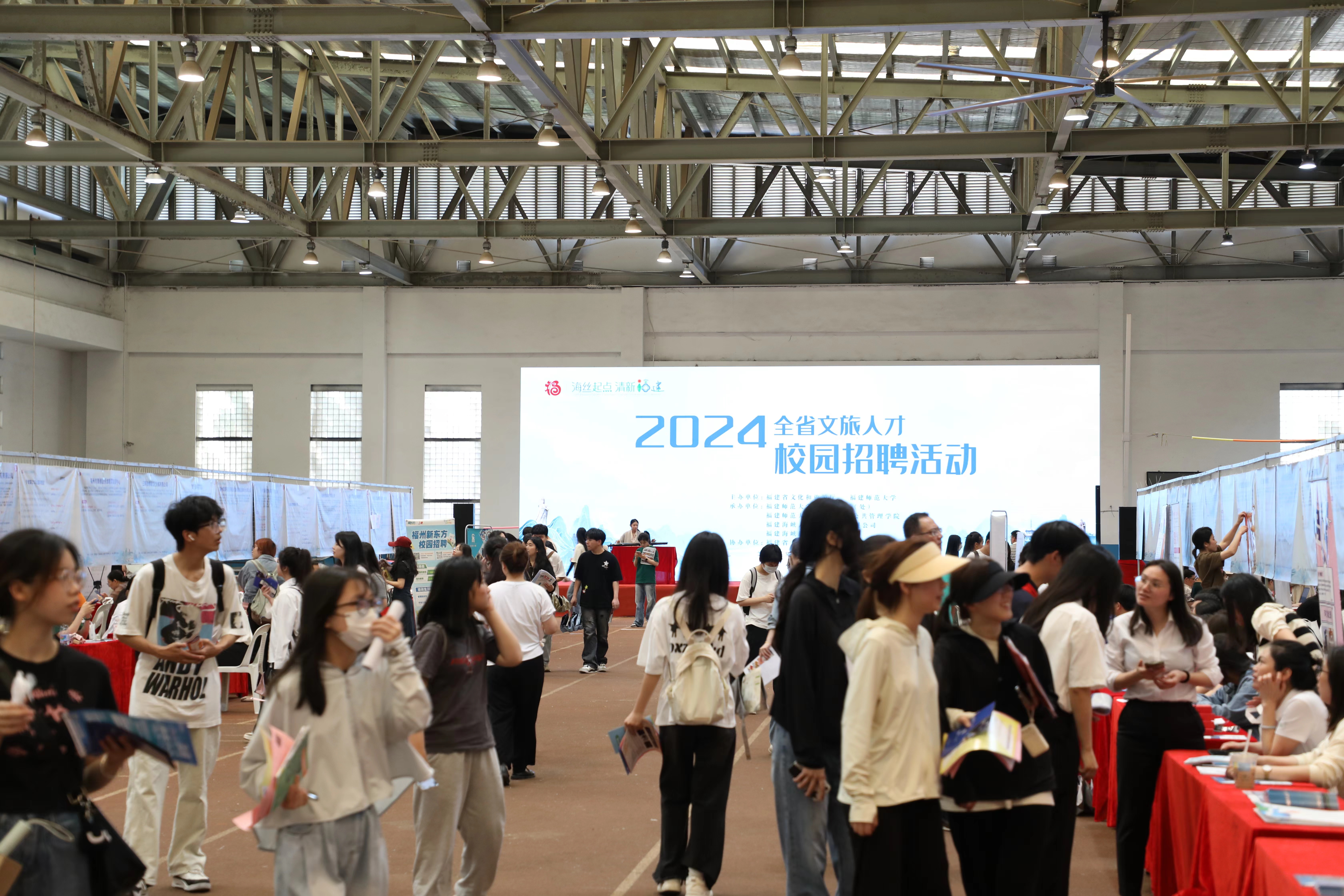 招聘会于5月18日在旗山校区室内田径场举行,由省文旅厅和我校联合主办。省文旅厅党组副书记、副厅长林守钦,省文旅厅人事处处长谢琚、福建省闽台文化交流中心、福建海峡旅游人才发展中心主任郑金龙,省文旅厅政策法规处副处长欧星,省文旅厅人事处二级调研员张可,校党委副书记涂荣,学生工作部、各学院分管学生工作负责人,毕业班辅导员以及2024届毕业生参会。